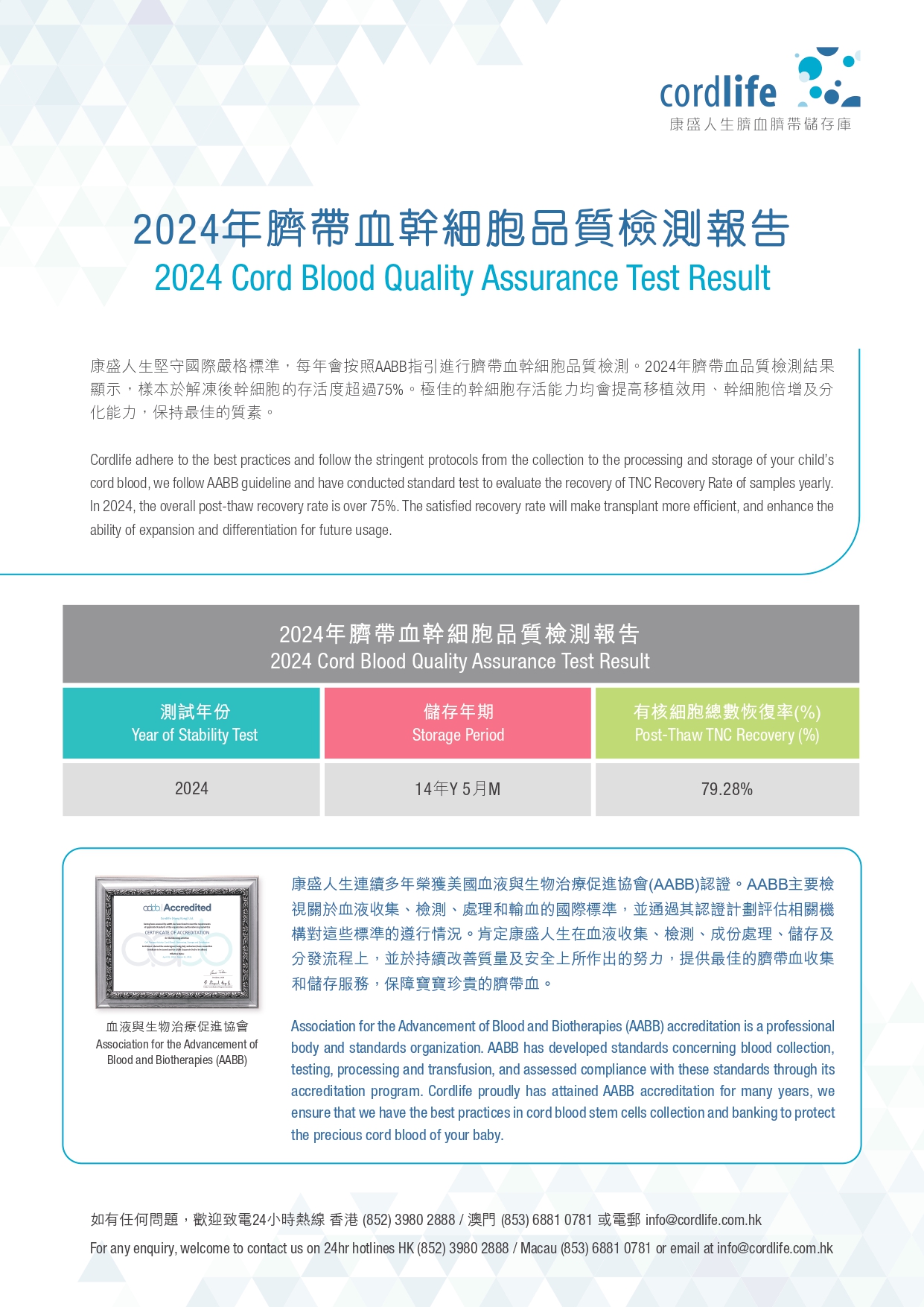 2024年臍帶血幹細胞品質檢測報告 康盛人生堅守國際嚴格標準,每年會按照AABB指引進行臍帶血幹細胞品質檢測。2024年臍帶血品質檢測結果顯示,樣本於解凍後幹細胞的存活度超過75%。極佳的幹細胞存活能力均會提高移植效用、幹細胞倍增及分化能力,保持最佳的質素。